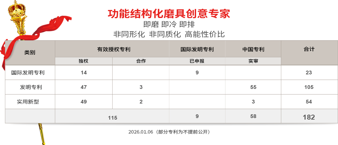 拥有各类磨具授权/已申报专利及独有工艺技术,愿通过社会化广泛性合作,将专利技术产业化,互利共赢,扩大经济效益和社会效益。11