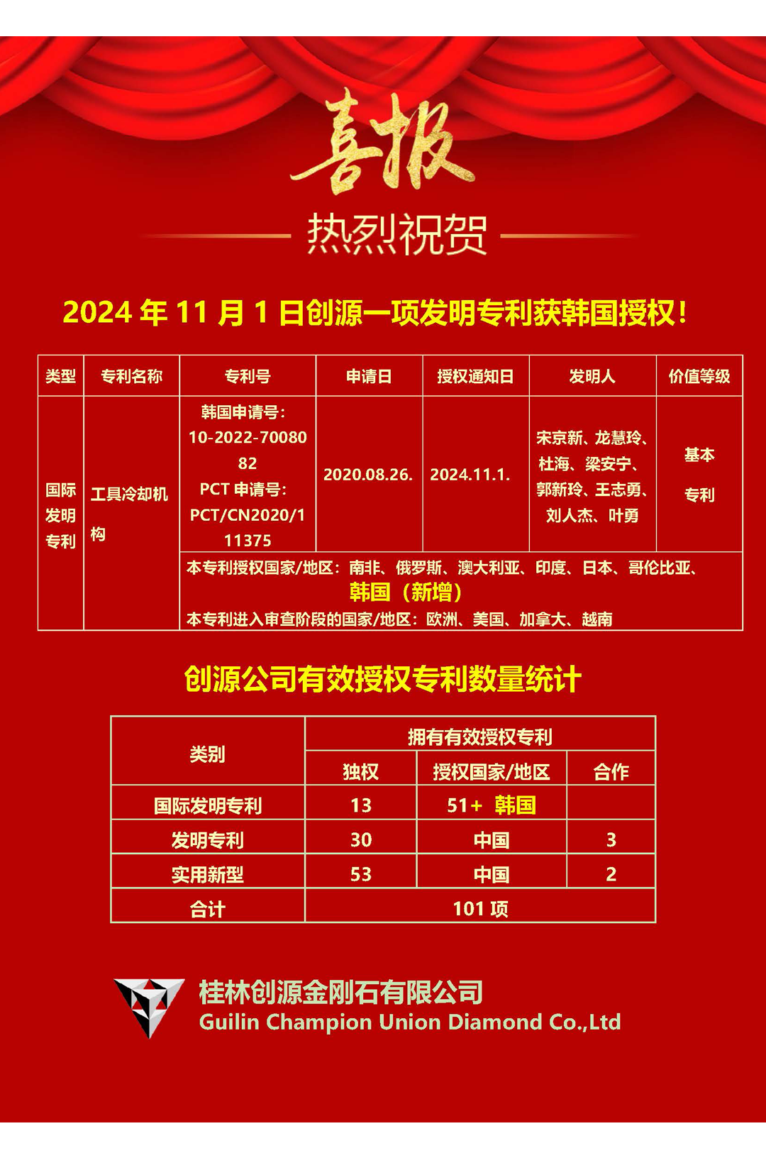 2024年11月1日创源一项发明专利获韩国授权!
